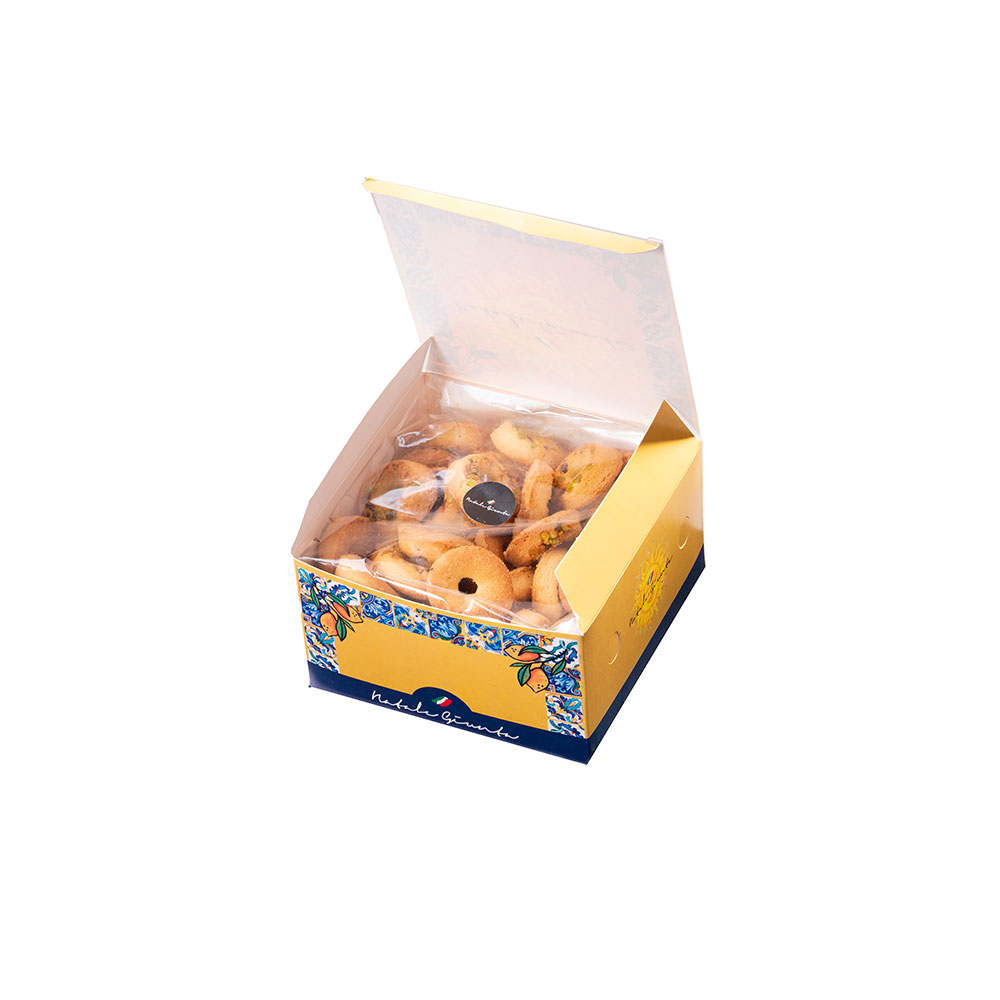 Pistachio biscuits sold in packs of 250 and 500 gr.