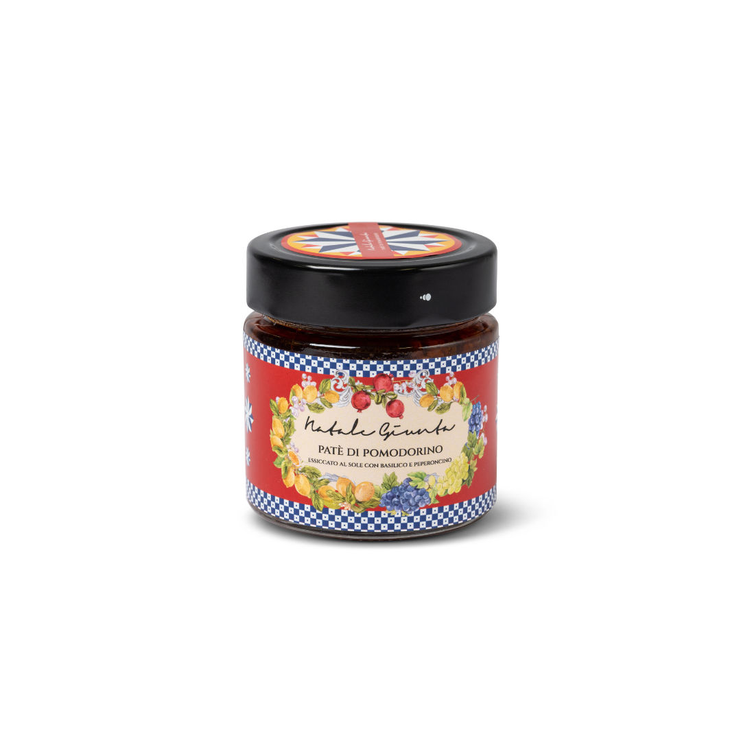 Prepared with selected cherry tomatoes and naturally dried in the Sicilian sun, Tomato Patè is a very tasty, pleasantly spicy and aromatic condiment. Perfect for preparing a first course with a strong taste, it is the right ingredient to give a Mediterranean touch and an intense taste to your bruschetta, meat or fish second courses, or simply to enrich a salad.