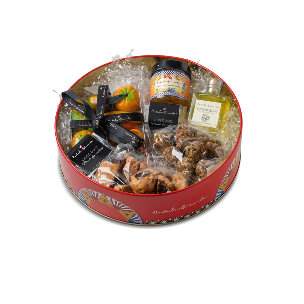 Una splendida latta a tema siciliano che contiene prodotti preparati artigianalmente.