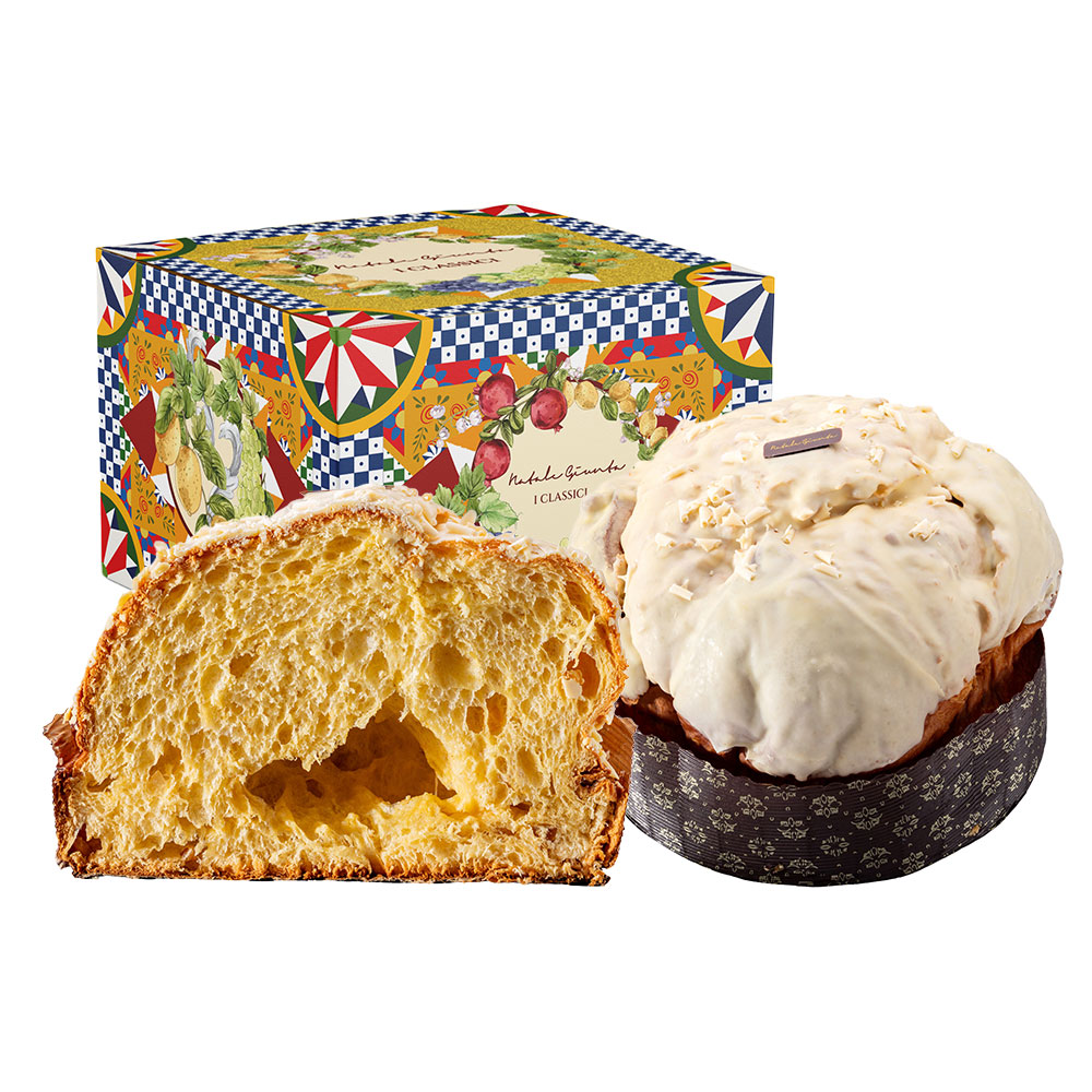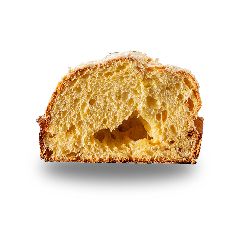 Senza coloranti e conservanti, glassa fatta a mano: irregolare e diversa in ogni panettone, spessa e croccante.
