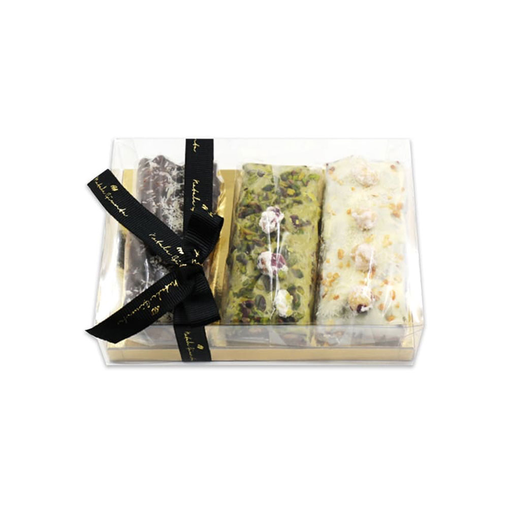Tre varietà di torrone siciliano in un’unica confezione elegante e ideata per soddisfare le voglie dei più golosi: Cioccolato bianco e nocciole tostate – Cioccolato Extra fondente e cocco – Crema di pistacchio e Croccanti